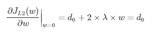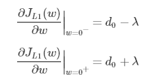 可见,引入L2正则时,代价函数在 0 处的导数仍是 d0 ,无变化。而引入L1正则后,代价函数在0处的导数有一个突变。从 d0 + λ 到 d0 − λ ,若 d0 + λ 和 d0 − λ 异号,则在 0 处会是一个极小值点。因此,优化时,很可能优化到该极小值点上,即 w = 0 处。