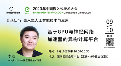 Imagination Technologies 中国区首席技术专家李安受邀出席大会,并将于9月10日下午四点的嵌入式人工智能技术与应用分论坛上,带来《基于GPU与神经网络加速器的异构计算平台》的主题分享。